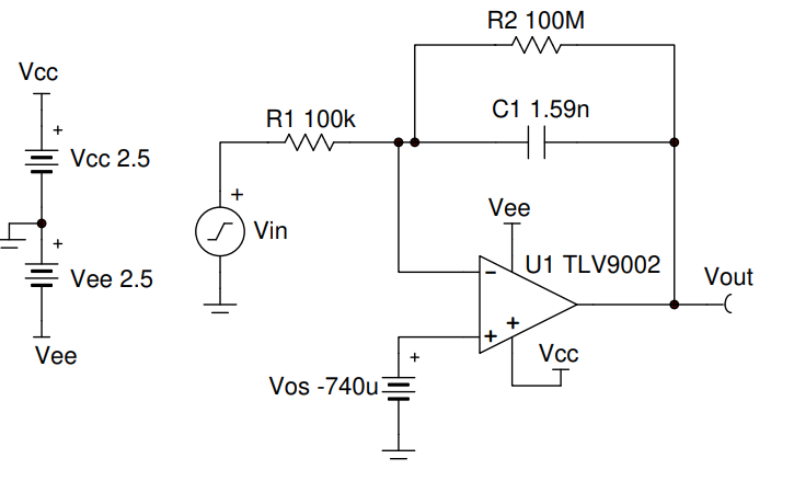 理想积分器的传递函数是:$$V_{out} = -\frac{1}{R_1C_1}\int^{T_1}_{T_0}{V_{in}(t)}dt$$ 对于直流激励则有: $$V_{out} = -\frac{V_{in}}{R_1C_1}(T_1-T_0)$$
