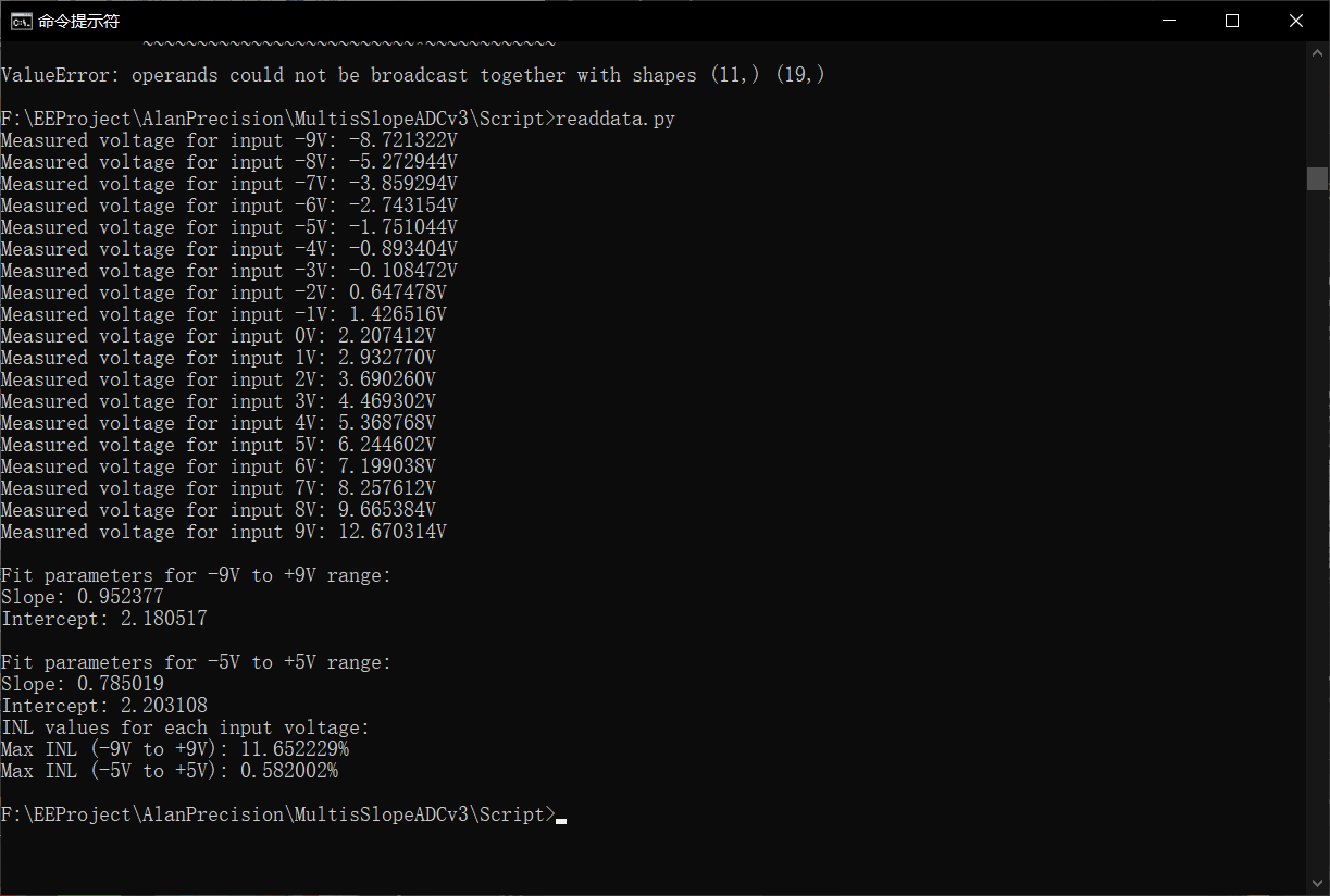 使用常规的bangbang控制,该版成功在10NPLC下实现了4位分辨率,在没有使用MOSFET非理想缓解开关模式的情况下,最大INL为0.58% 。该转换器在每次转换结束后通过串口发送二进制数据,以下是使用一个python脚本解码并计算INL的结果:
