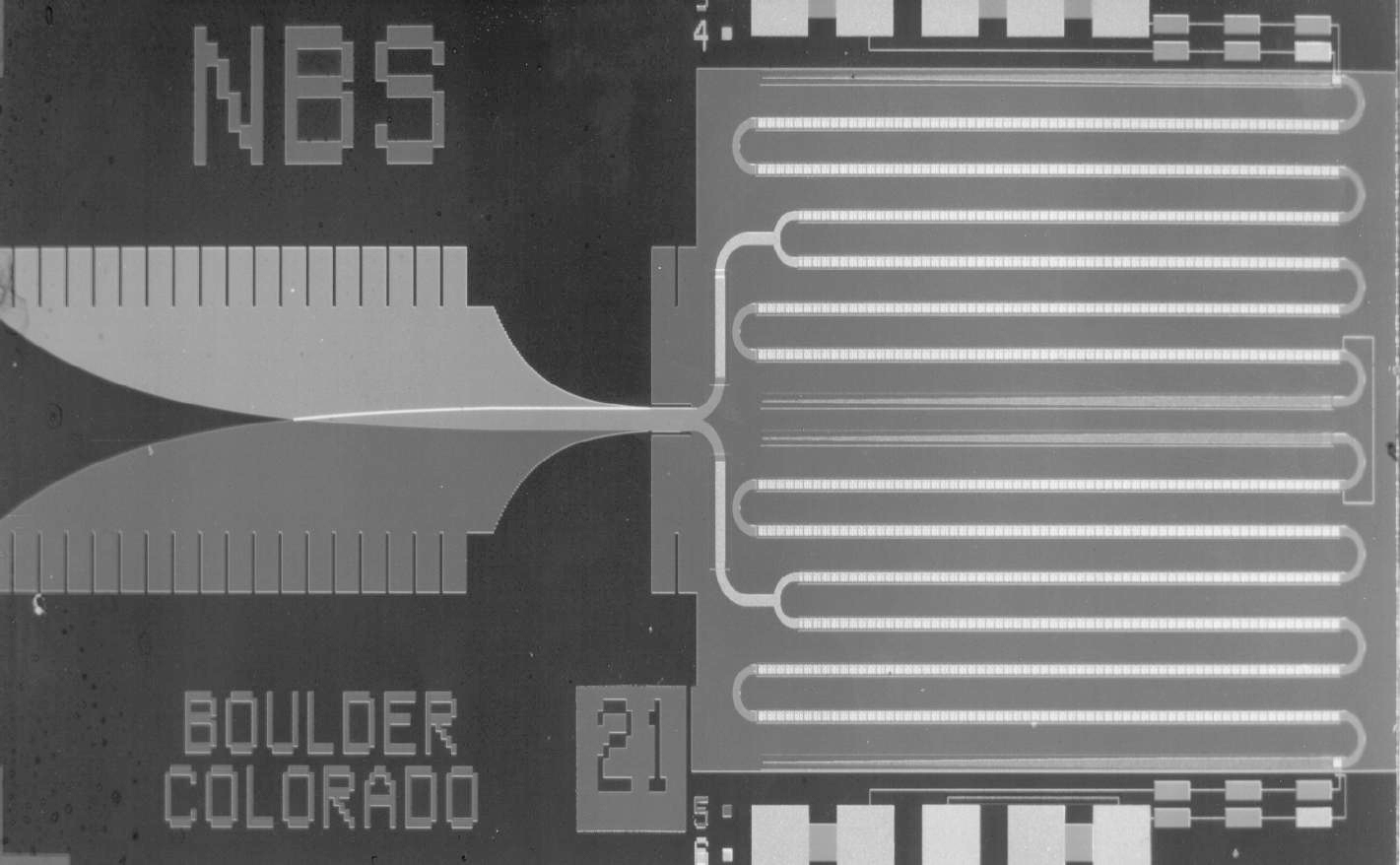 左图为NIST生产的约瑟夫森直流电压基准芯片,具有3020个结点,用于产生1V电压,工作时需要用液氦冷却。