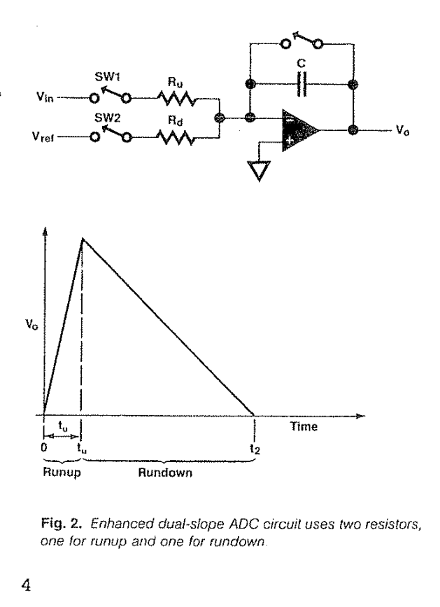 若$V_{ref}$是准确的且整个模拟部分系统又是理想的,该ADC的输出分辨率就是$\frac{T_2-T_1}{T_1-T_0}$即$T_1-T_0$的分辨率,而频率的精度对比电压的精度高几个数量级,据此我们只需要增加数字计数器的频率就可以显著提升分辨率,因而该种ADC在各种简单的直流电测仪器中广泛使用。稍加改进,让$V_{ref}$和$V_{in}$使用不同的斜率执行两个斜坡,最终公式为$$V_{in}=-V_{ref}\frac{T_2-T_1}{T_1-T_0}\frac{R_{vref}}{R_{vin}}$$