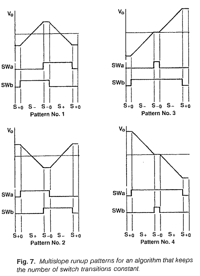 因此,一方面为了解决制造性问题,另一方面实现较为灵活的工作范围,我们采取了较小的积分器时间常数以获得小型的被动元件尺寸,并在RunUp时使用开关在$+V_{ref}$ 和 $-V_{ref}$之间切换,以控制积分电压不饱和,也就是 (注意式子右侧的残差电压):$$\frac{V_{in}t_{in}}{t_{total}}+\frac{+V_{ref}t_{posref}}{t_{total}}+\frac{-V_{ref}t_{negref}}{t_{total}}=V_{residual}$$ 在这一阶段通常最大可使仪器获得约一半的分辨率。