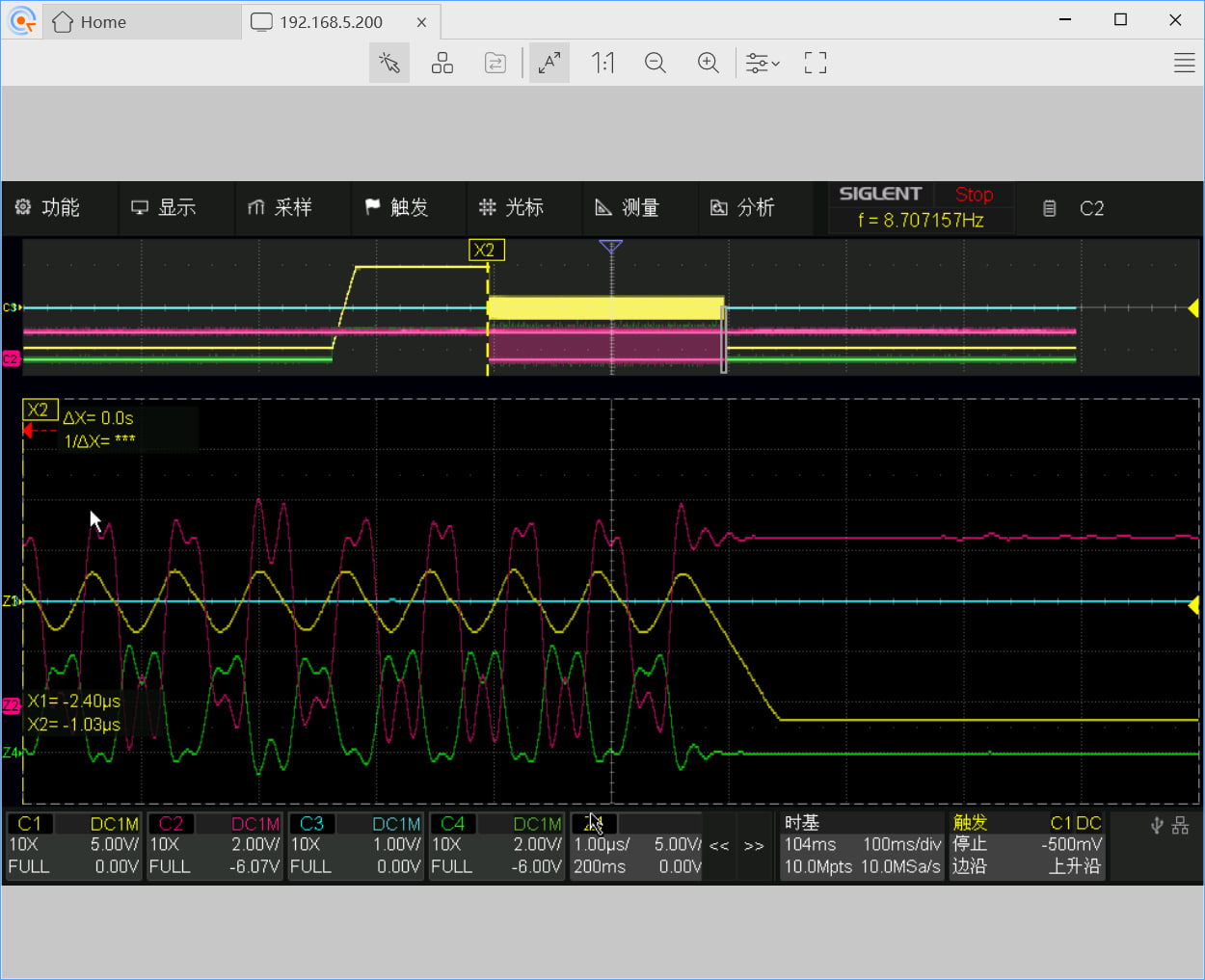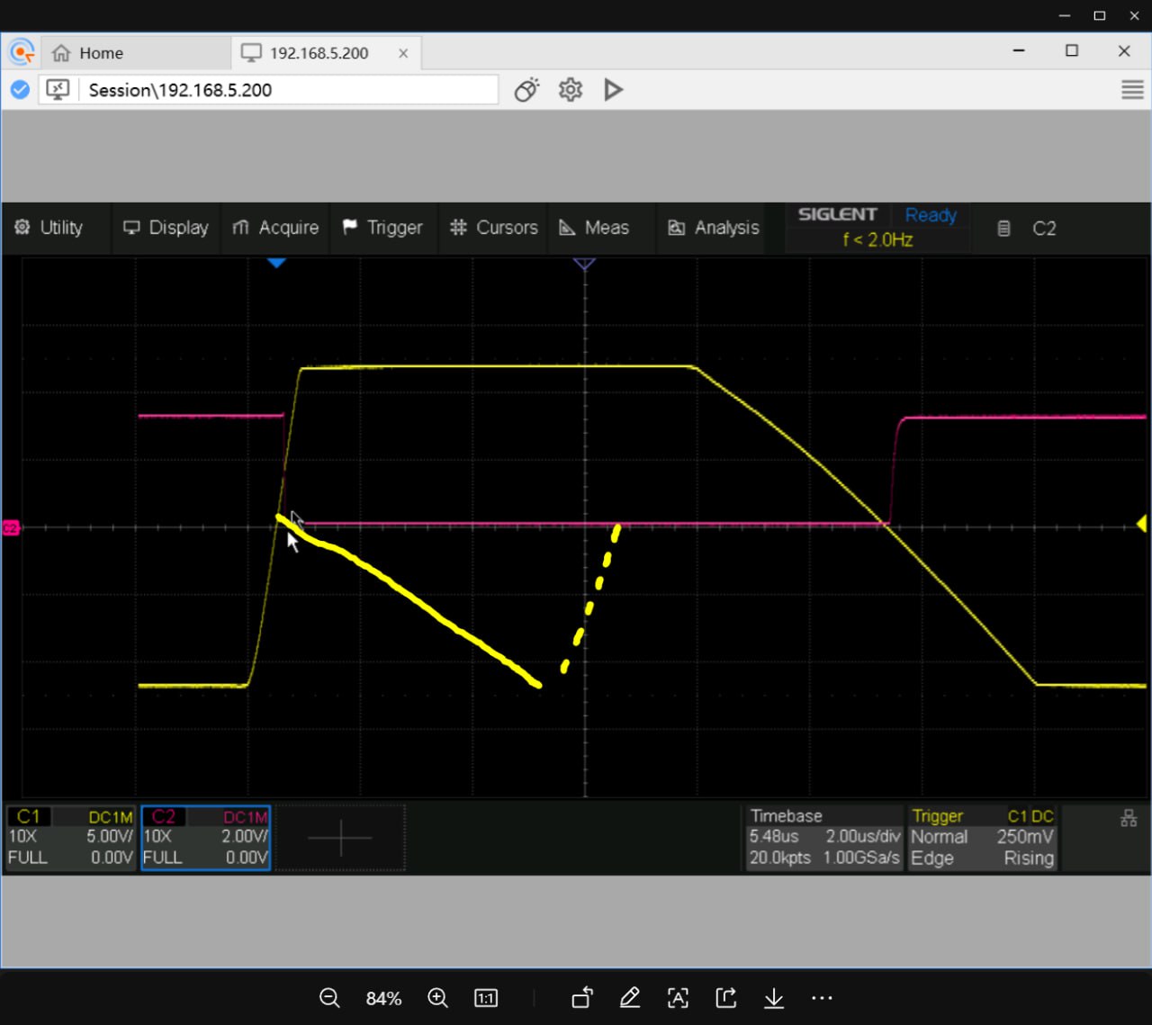该版原理图有诸多问题,譬如:LM311的输入级压摆率不高,这将产生极大的延迟,因此需要用电阻分压将输入级电压限制到较低的摆率,详见TI E2E。其次,1nF+1k的RC组合太小了,STM32中断到GPIO所需时长太长,以至于积分器直接饱和(见上图),完全无法工作。另外,输出FLASH ADC搬移电路太过复杂。