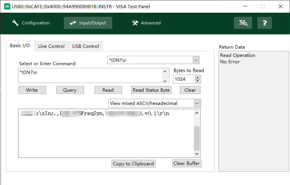 }至此,USB488 已然实现完毕,打开设备管理器就可以看到一个 IVI 设备(需要先安装 VISA 驱动,如 Keysight IO Suite 和 NI-VISA)。打开 NI-MAX 并查询 *IDN?,结果如下: