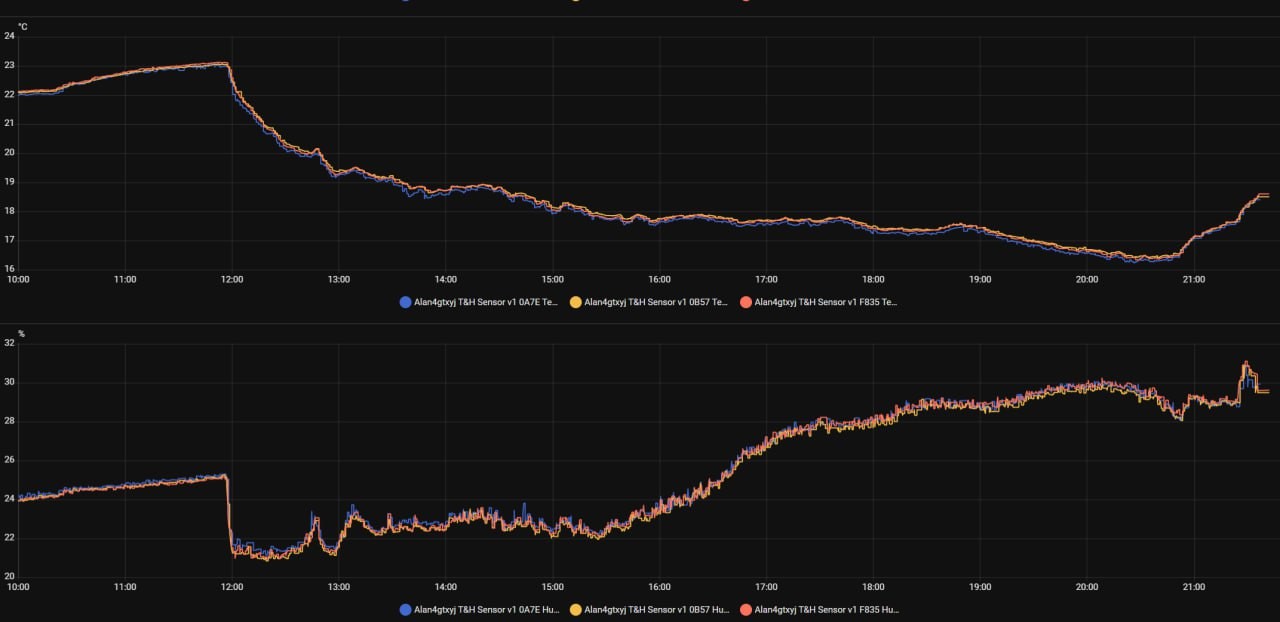 由于 Zephyr 已经包含了 SHT40 的驱动和全部所必须的低功耗处理部分,只需要简单编写一些胶水即可使其顺利工作。值得注意的是,任何情况下激活调试端口会大幅提高本底电流值,因此在最终构建中需要完全移除 CONSOLE 配置。同样,saadc 因为调用的是 nrfx 库而不能正确在空闲线程中休眠,所以在每次读取结束后都需要 deinit 下电。对于 Zephyr,ktimer 中不能执行过长时间的任务(甚至可能不足以执行任何库函数!),否则可能导致一些竞态。对于生产应用来说,在 UICR_CUSTOM[15:0] 为非全 0xFF 时将选取 UICR 而非预定义密钥。完整工程可以在 https://github.com/AlanCui4080/nRF52832SHT40Sensor 找到。
